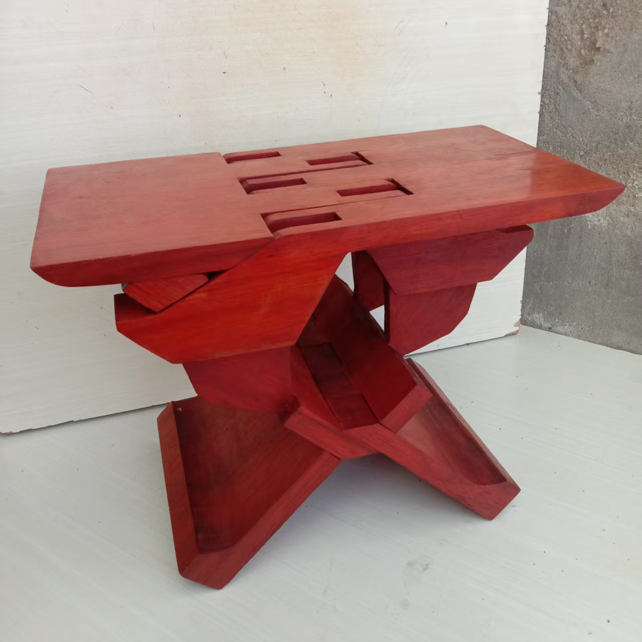 鲁班凳又称鲁班枕,俗名“瞎掰”,用一块整木做成,没有一钉一铆,无胶,不用组合,可以自由张开、闭合,却不会完全分离,传说是2600年前鲁班发明的。