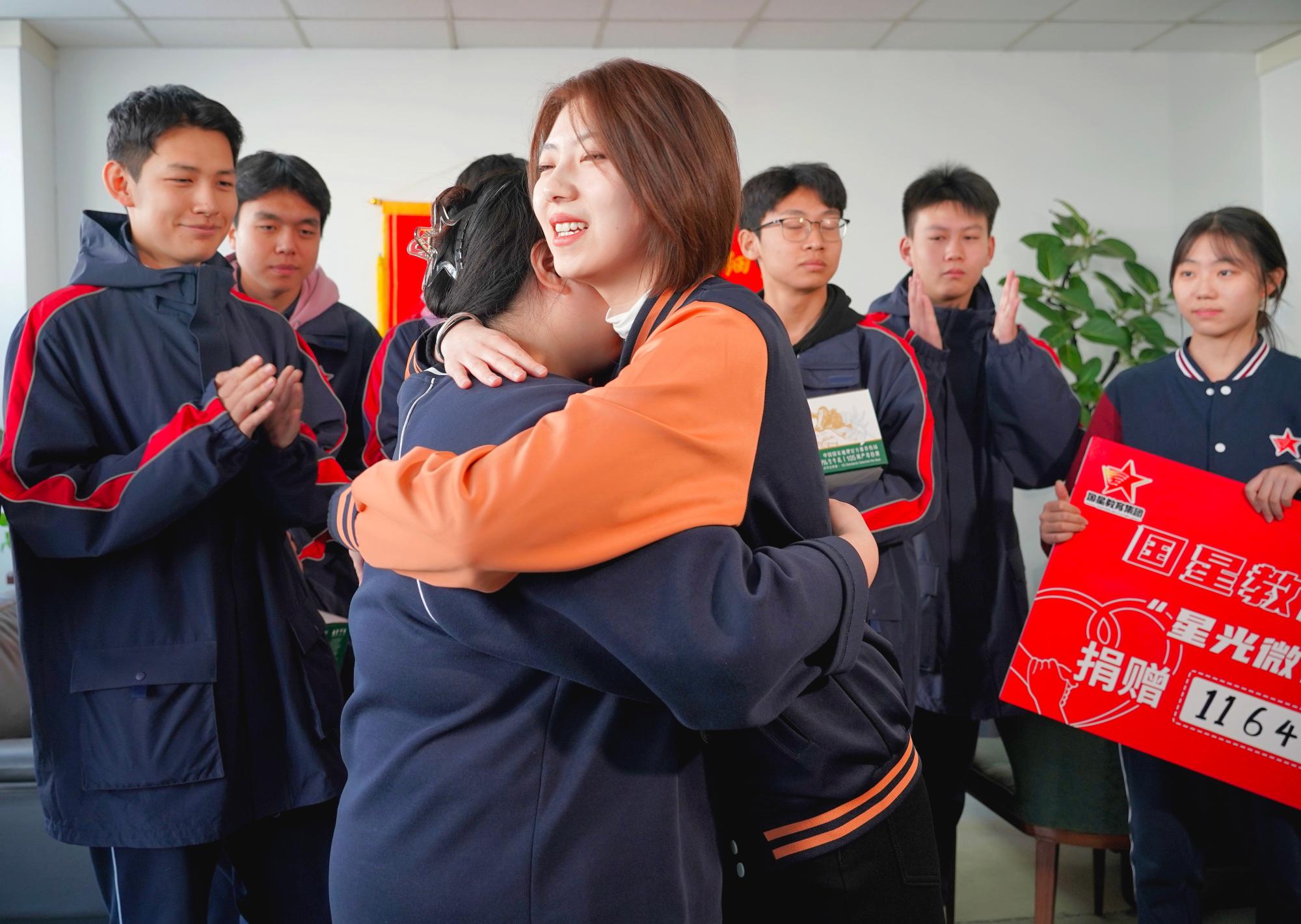 国星教育集团团委书记李雨佳拥抱鼓励李童玲