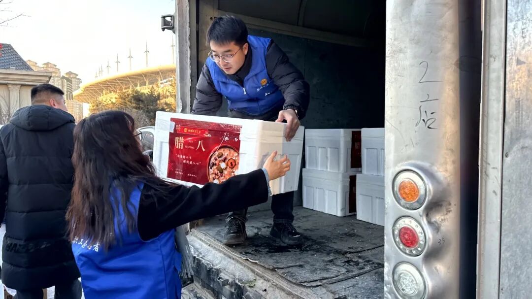 将精心封装、贴有工会标识的腊八粥