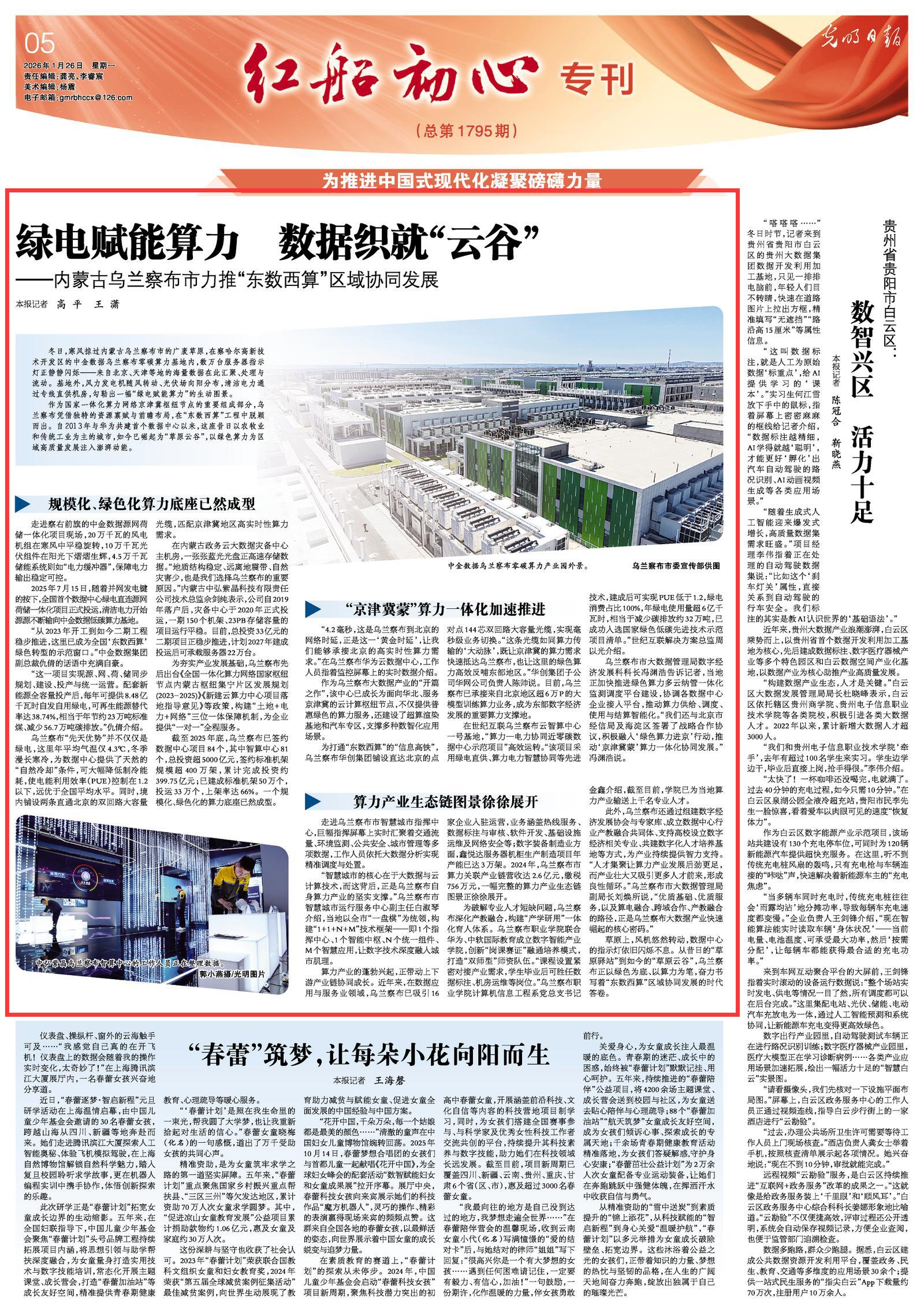 2026年1月26日《光明日报》第5版刊发了《绿电赋能算力 数据织就“云谷”——内蒙古乌兰察布市力推“东数西算”区域协同发展》的文章,报道了从昔日的“草原驿站”到如今的“草原云谷”,内蒙古乌兰察布市正以绿色为底、以算力为笔,奋力书写着“东数西算”区域协同发展的时代答卷。
