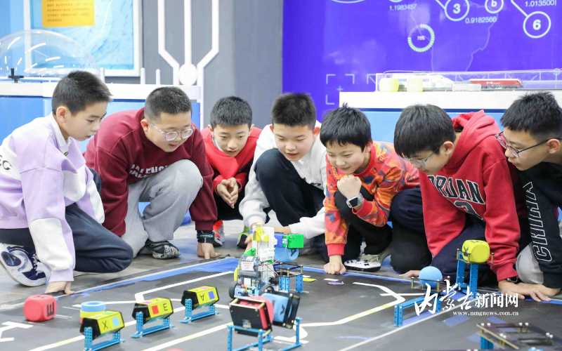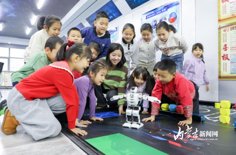 1月26日,孩子们在呼和浩特市玉泉区青少年宫与智能机器人开心互动。寒假期间,许多中小学生走进呼和浩特市玉泉区青少年宫科技馆,学习科学实验、机器人编程与操控等课程,在探索与实践中培养对科学技术的兴趣和爱好,丰富假期生活。摄影/草原云·内蒙古新闻网首席记者 牛天甲