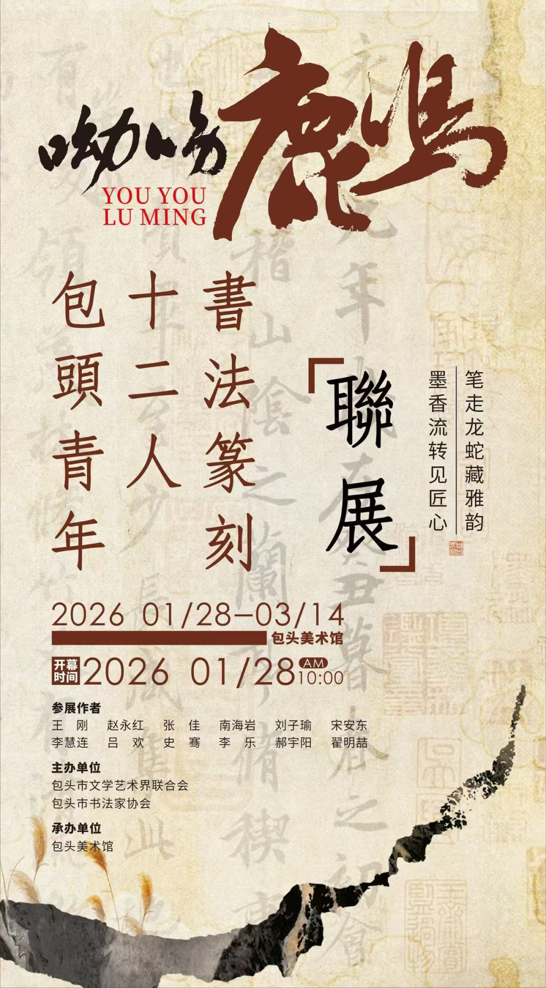 2026年新春将至,包头美术馆推出“呦呦鹿鸣——包头青年十二人书法篆刻联展”。