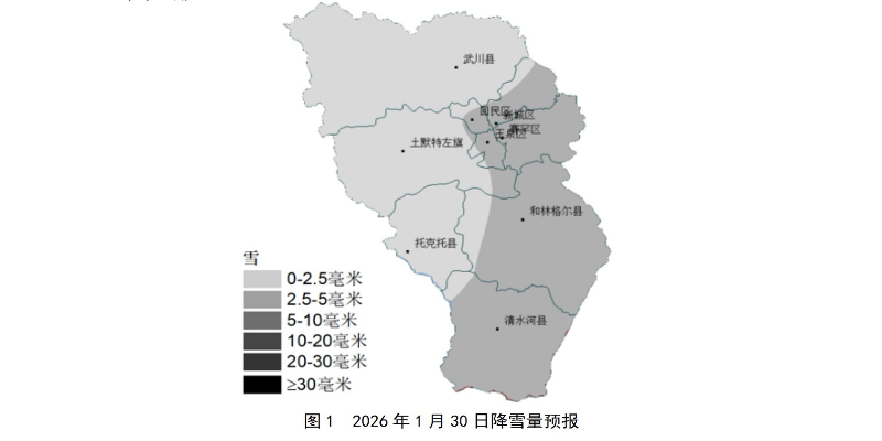 降雪方面,1月30日凌晨开始至傍晚前后,全市大部将出现小到中雪天气。武川县、土默特左旗、托克托县以小雪为主,降雪量1~2.5毫米;市区、和林格尔县、清水河县大部地区有中雪,降雪量为3~4毫米;和林格尔县东部及清水河南部局部地区可能出现5毫米以上的大雪。1月30日傍晚局部仍有小量分散性飘雪。