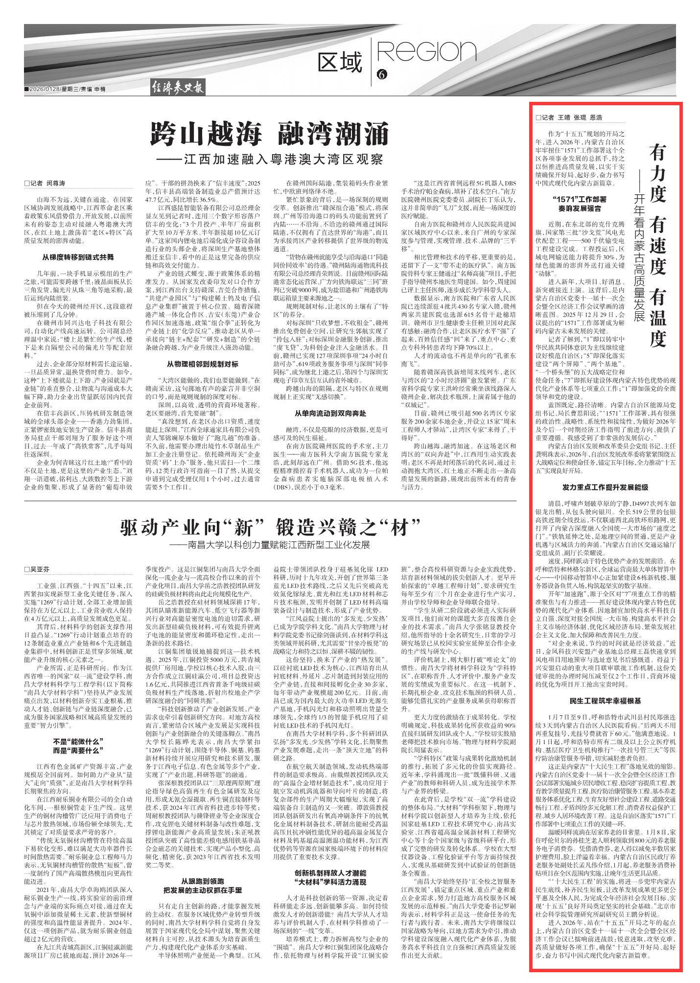 2026年1月28日《经济参考报》第6版刊发了《有力度 有速度 有温度——开年看内蒙古高质量发展》的文章,报道了进入2026年,站在“十五五”开局之年的起点上,内蒙古自治区党委十一届十一次全会暨全区经济工作会议已擂响前进战鼓:锐意进取,攻坚克难,高质量做好各项工作,确保“十五五”开好局、起好步,奋力书写中国式现代化内蒙古新篇章。