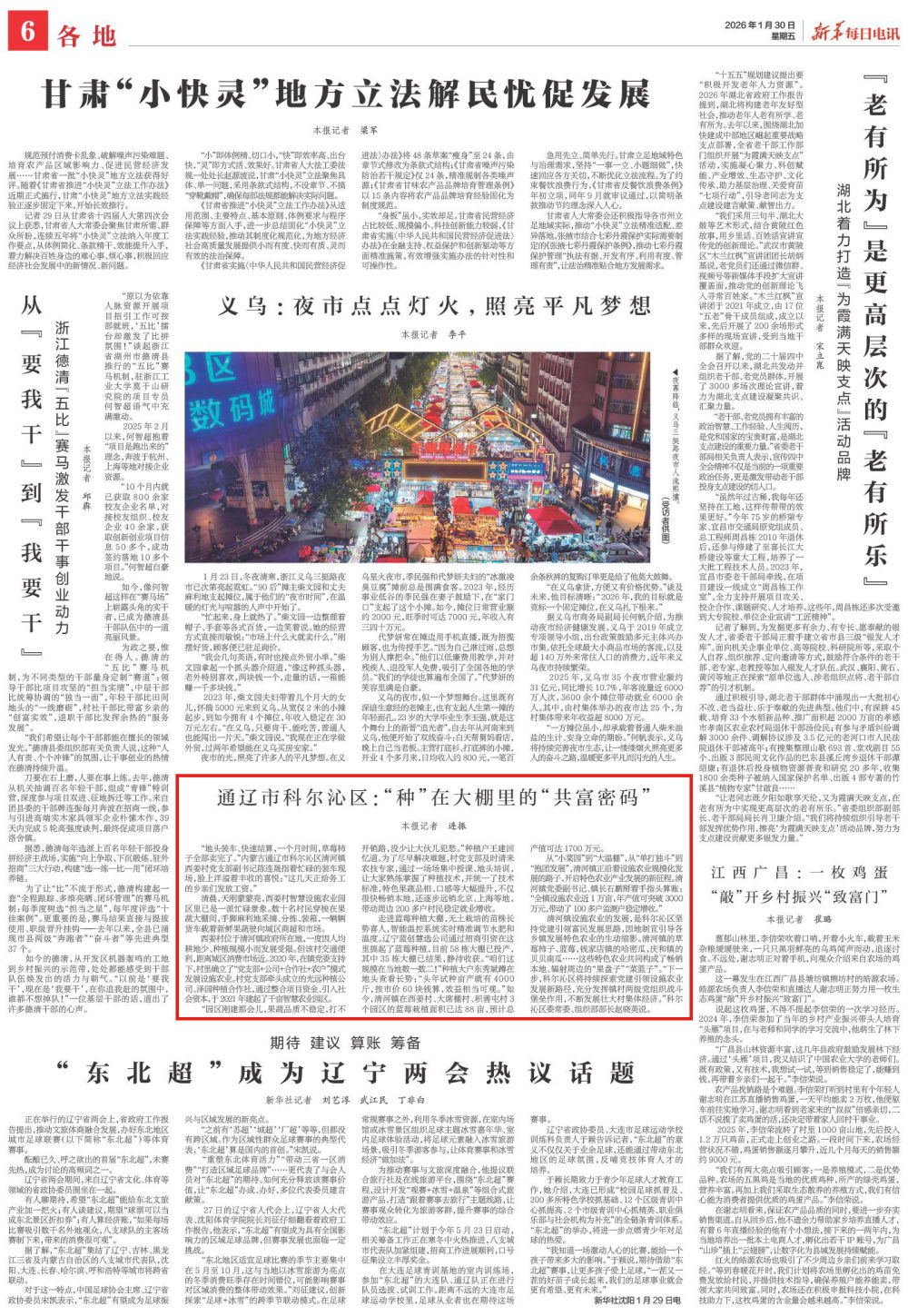 2026年1月30日,《新华每日电讯》第6版刊发题为《通辽市科尔沁区:“种”在大棚里的“共富密码”》的文章,报道了通辽市科尔沁区坚持党建引领富民发展思路,因地制宜引导各乡镇发展特色农业。