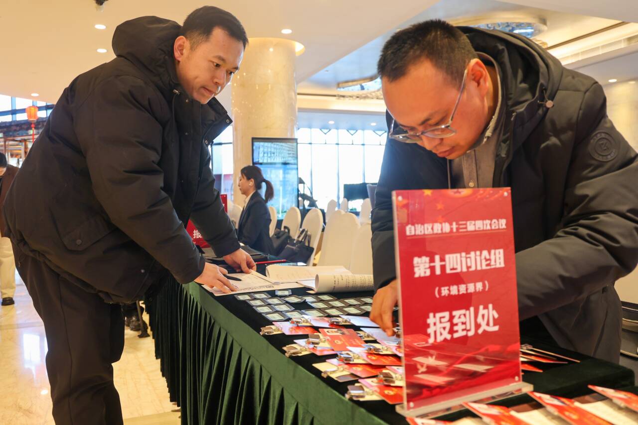 出席自治区政协十三届四次会议的政协委员(右)在驻地报到。