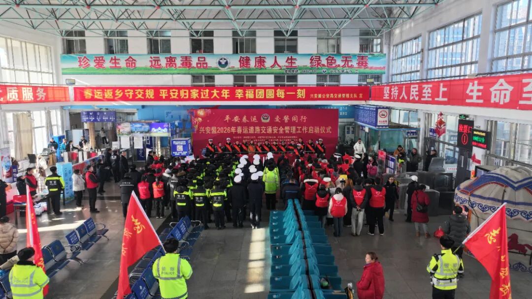 当日,为期40天的2026年春运正式启动。兴安盟公安局交管支队联合内蒙古自治区公安厅高速公路五支队天骄大队、乌兰浩特市公安局交管大队在此开启了以“平安春运·交警同行”为主题的春运启动仪式,打响了春运交通安全保卫战。