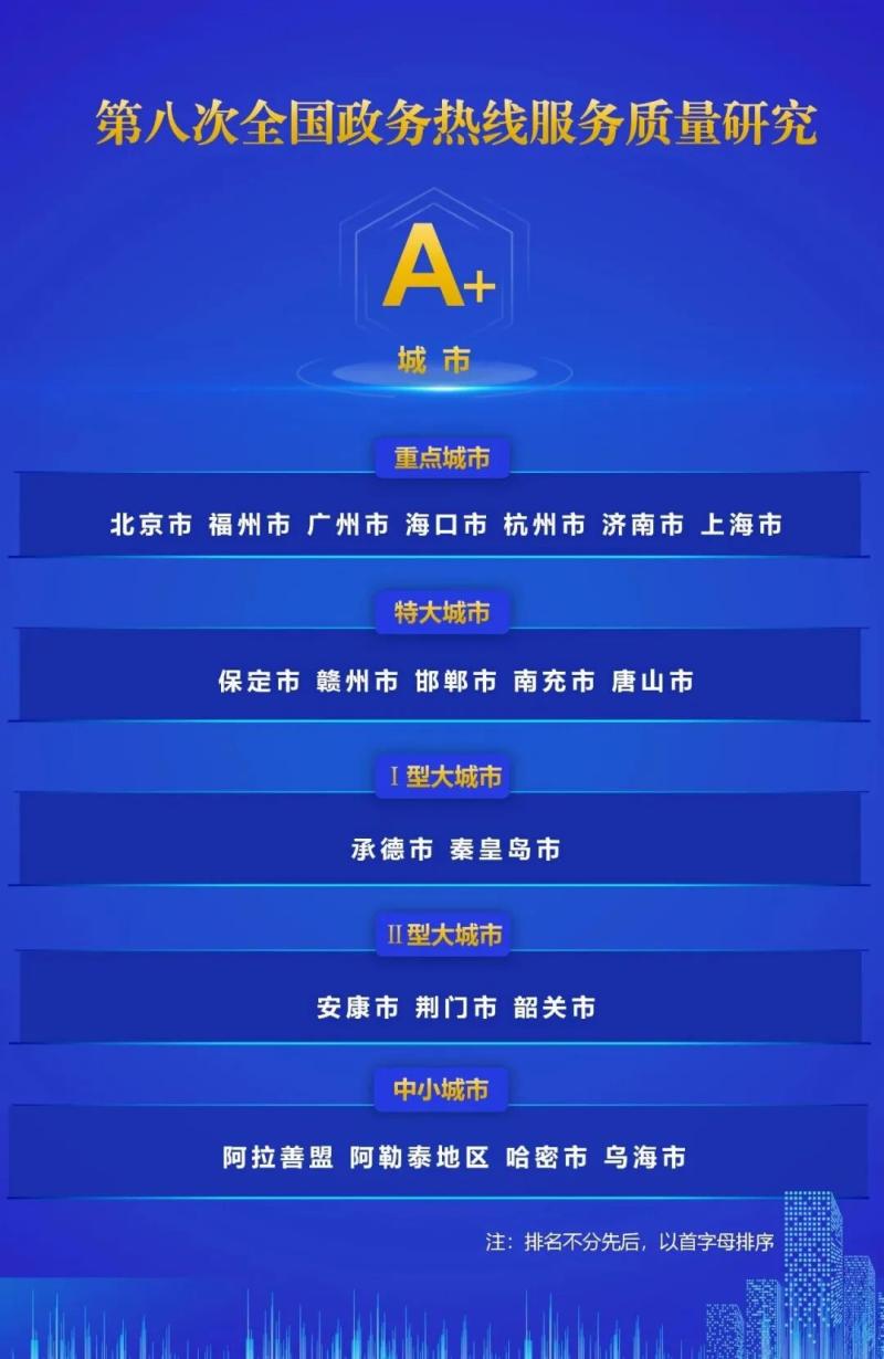 近日,“热线发展与治理创新”深度研讨活动在福建省福州市举行,现场发布《第八次全国政务热线服务质量研究报告》,阿拉善盟12345热线再度获评全国中小城市政务热线服务质量A+最高等级,实现“三连冠”。