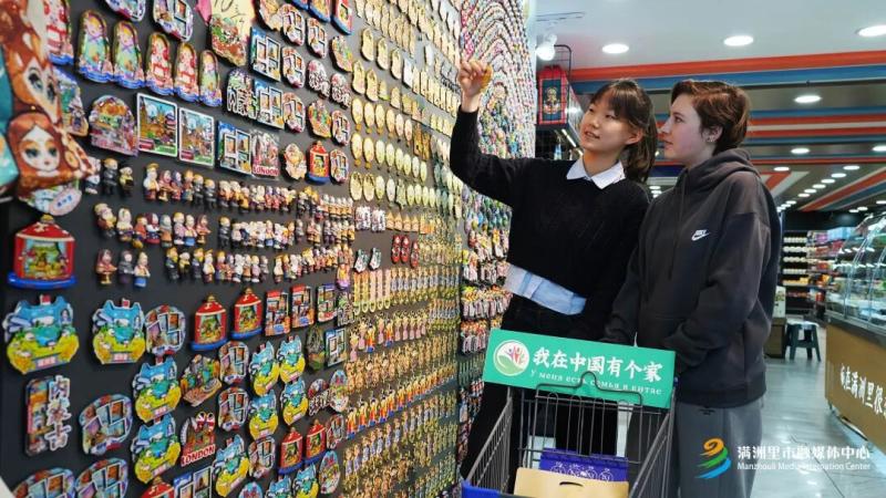 特色商品店里,中俄文化悄然交融:俄罗斯黑巧克力旁摆着红彤彤的中国结,手工琥珀饰品一侧是绘有“福”字的喜庆摆件。阿柳娜的指尖在两国产物间流连,“每一件都想带回家!”她的小背包渐渐鼓了起来,“我已经和爸爸妈妈说好了,以后每年都要来满洲里过年!”