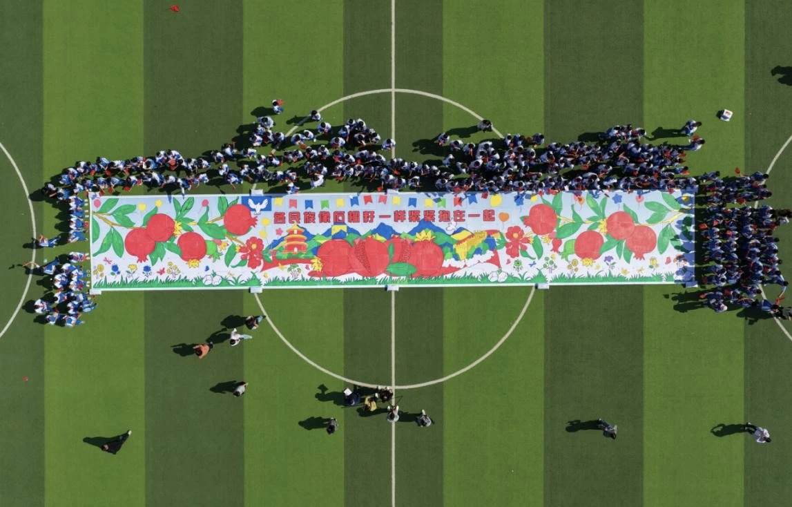 红山区校园里孩子们展示“各民族像石榴籽一样紧紧抱在一起”巨幅画(资料图)