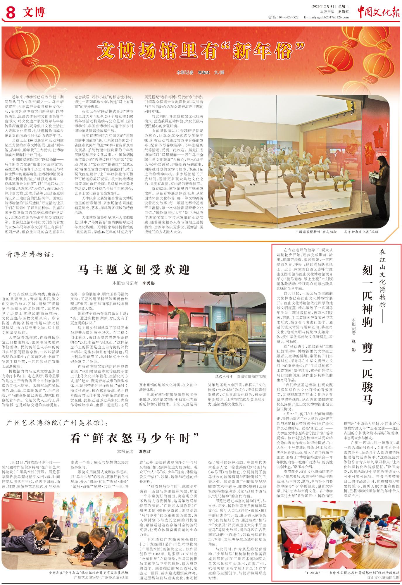 2026年2月4日,《中国文化报》第8版刊发题为《在红山文化博物馆——刻一匹神驹 剪一匹骏马》的文章,报道了红山文化博物馆依托深厚的地域文明底蕴,精心策划了一系列马年生肖主题社教活动,选取木刻版画、剪纸、手工装饰画等春节民俗艺术形式,指导参与者进行创作。通过沉浸式体验与趣味互动,将生肖文化、地域文明与传统节庆融为一体,使中华优秀传统文化听得见、看得见、可触摸。