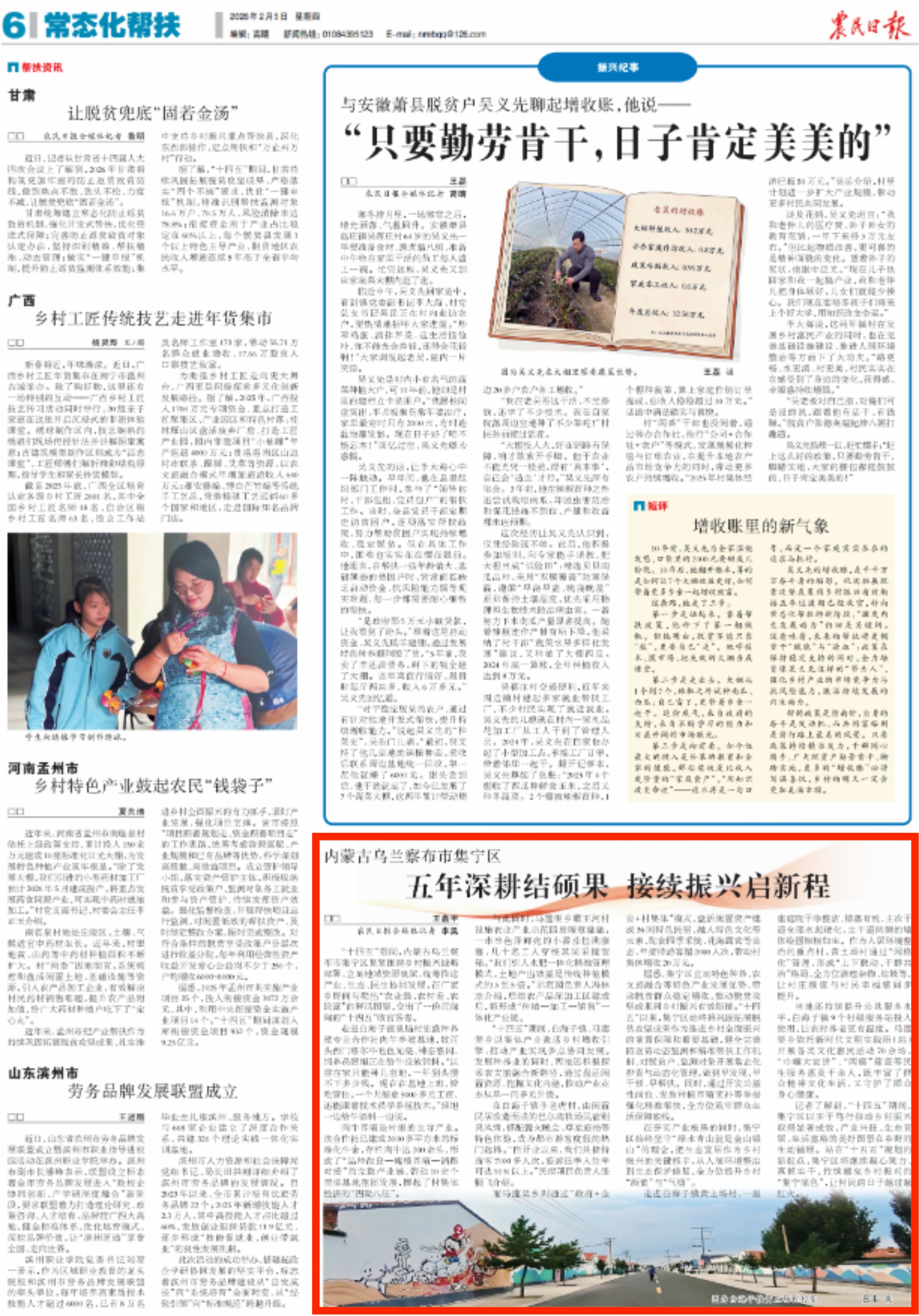 2026年2月5日,《农民日报》第6版刊发题为《内蒙古乌兰察布市集宁区:五年深耕结硕果 接续振兴启新程》的文章,报道了内蒙古乌兰察布市集宁区紧紧围绕乡村振兴战略部署,立足地域资源禀赋,统筹推进产业、生态、民生协同发展,在广袤乡野间勾勒出“农业强、农村美、农民富”的鲜活图景,交出了一份沉甸甸的“十四五”收官答卷。