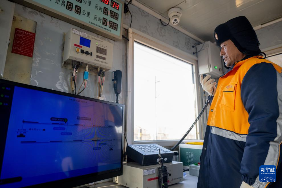 2月1日,徐中成与过往列车通信。新华社记者 连振 摄