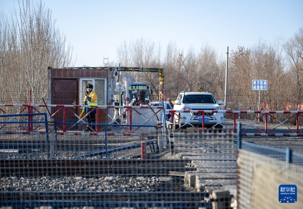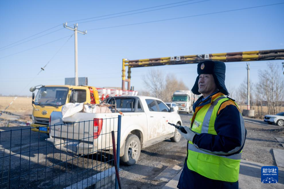 2月1日,工人张浩在道口指挥过往车辆通行。新华社记者 连振 摄