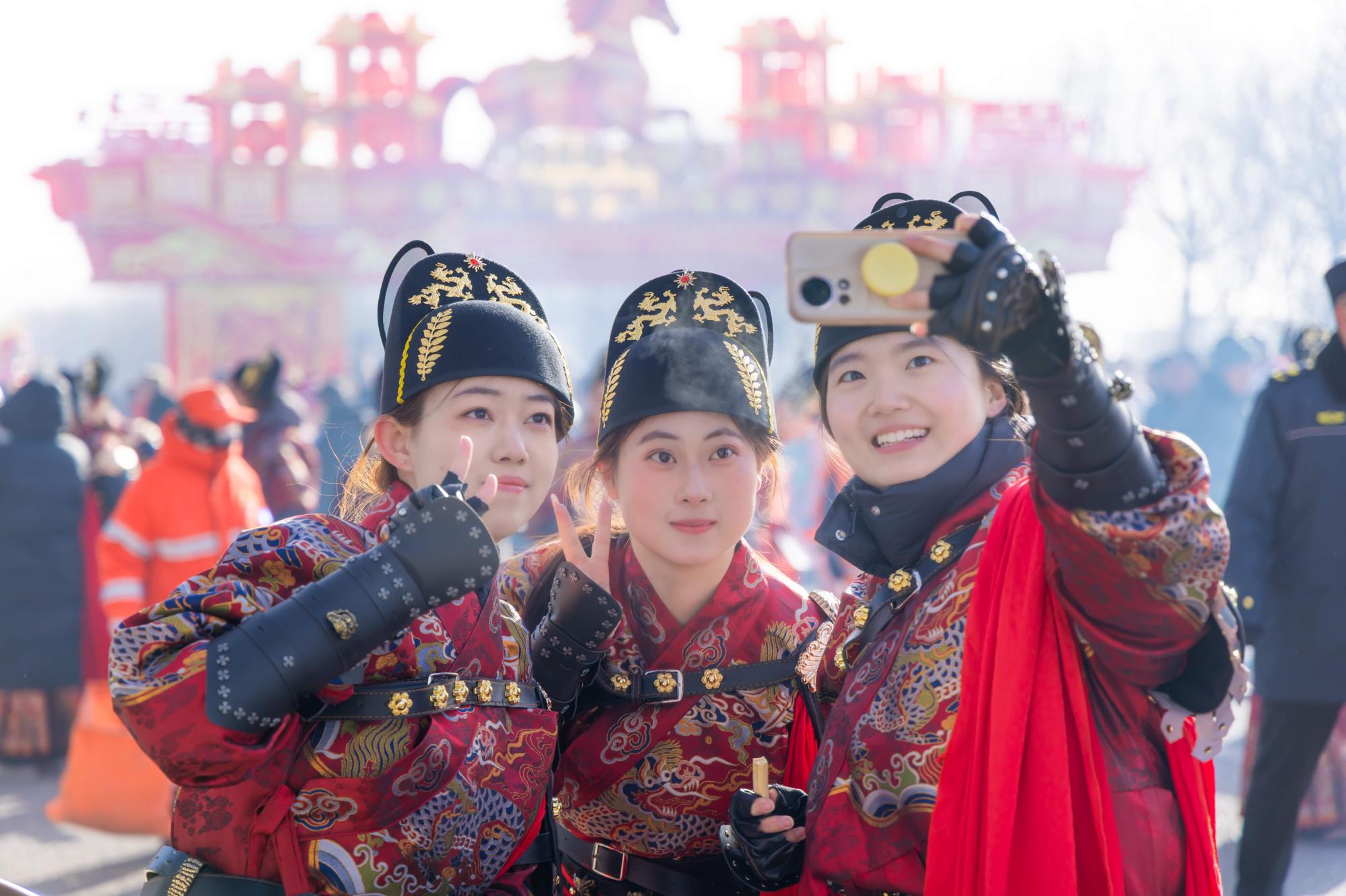 步入灯展现场,璀璨花灯与红灯笼交相辉映,将托克托县的历史底蕴与现代气息巧妙融合。30余名返家乡大学生志愿者与社区志愿者化身的“大明锦衣卫”巡街展演,灵动的NPC舞蹈与小朋友们的欢声笑语交织在一起,身着传统服饰的志愿者们还向市民发放专属银票,凭票可兑换麻糖、享受住宿优惠,让沉浸式互动体验更具趣味。随处可见,一家老小携手赏灯,镜头下的每一张笑脸,都定格着团圆的幸福瞬间。