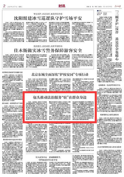 2026年2月11日《人民公安报》第2版刊发了《包头推动法治服务“驻”在群众身边》的文章,报道了2025年以来,包头公安以“党建联盟+”为纽带,整合社区、企业、学校等多元力量,广泛开展形式多样的普法宣传,积极参与基层社会治理,推动法治宣传与基层治理同频共振。