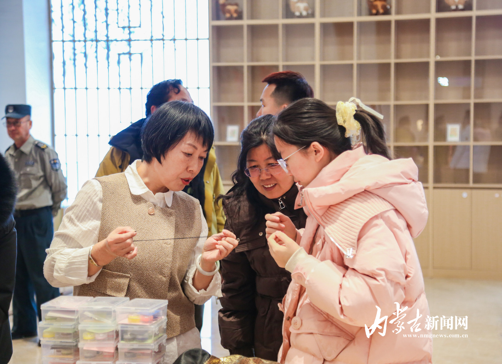 与此同时,内蒙古自治区文化馆一楼大厅,非遗互动体验区将春节的年味浓缩于指尖,成为最具人气的打卡地。剪纸、麻糖、手写春联、制作中国结、珐琅挂饰制作……非遗扎堆展示互动,年味十足。