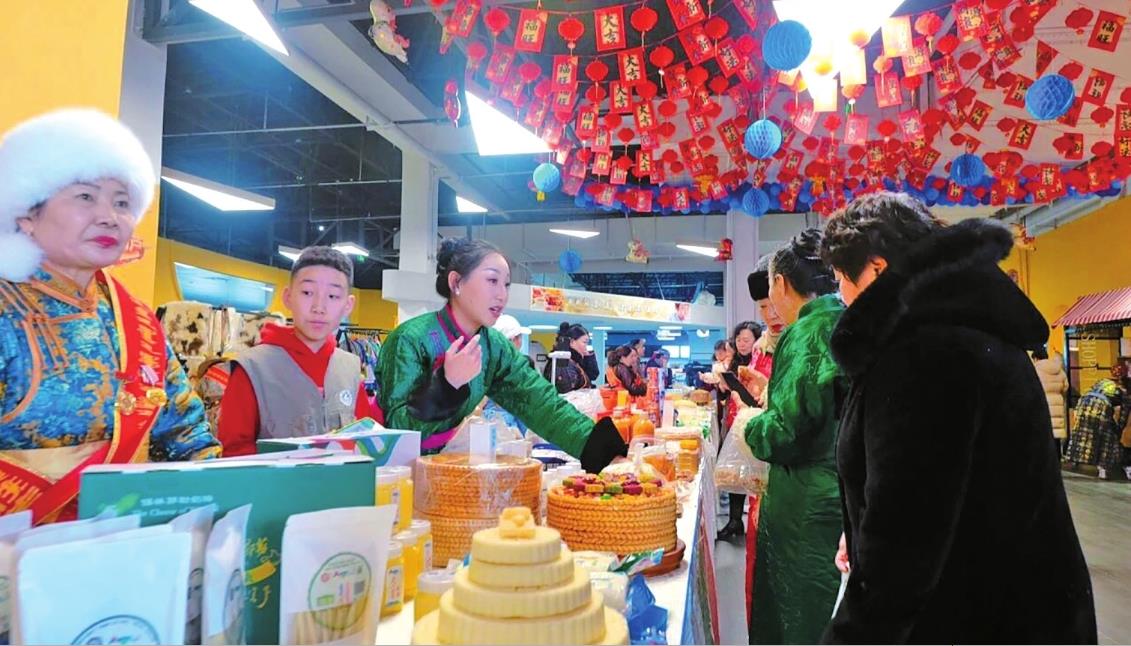 会场内年味浓郁。非遗展演区,毛毡艺术品生动展现草原特色;察干伊德传承人现场制作奶食,娴熟技艺吸引众多观众。年货市集上,奶制品、沙棘汁等特色商品琳琅满目,购销两旺。