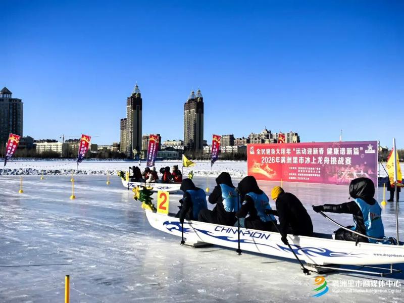 日前,由满洲里市文体旅游广电局、满洲里市直机关工委主办和满洲里市体育事业发展中心协办的全民健身大拜年——“运动迎新春 健康谱新篇”2026年满洲里市冰上龙舟挑战赛在北湖公园群众冰场举办。来自全市各机关、企事业单位及社会团体的21支参赛队伍齐聚赛场,150余名选手同台竞技,用速度与力量演绎传统民俗与冰雪运动的完美融合,为边城群众献上一场独具特色的冰雪体育盛宴。