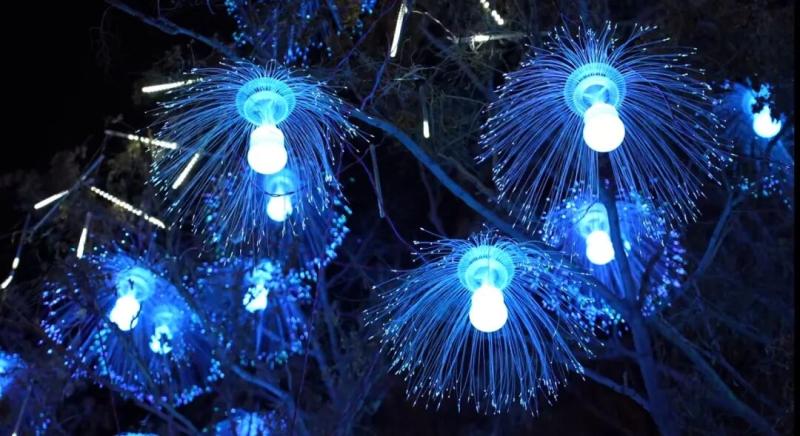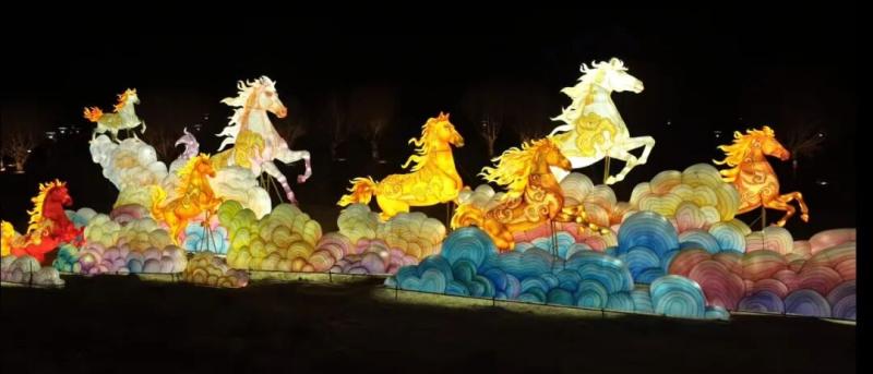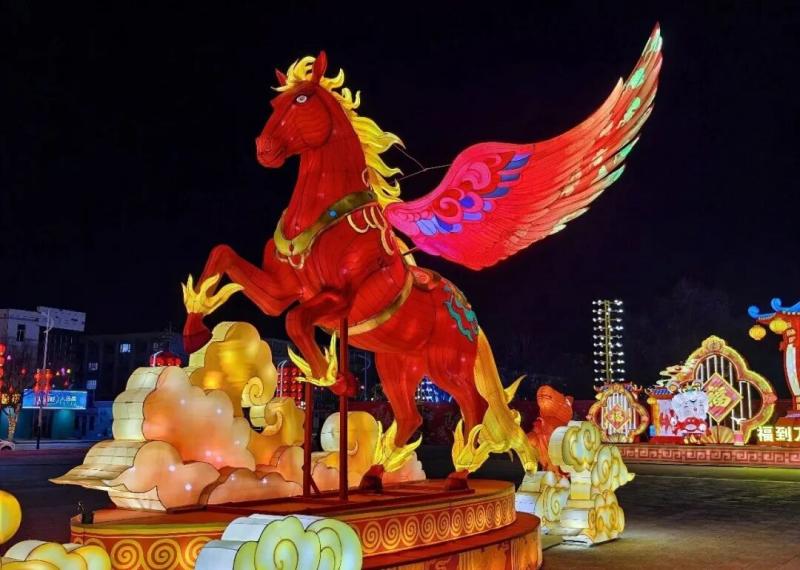 今年巴彦浩特新春灯会突出“马年”主题元素。在营盘山东坡广场,“八骏马”大型灯组气势恢宏,骏马踏光奔腾、鬃毛飞扬,尽显“骏马驰骋、盛世迎春”的磅礴气象。观景平台“马上发财”灯组憨态可掬,动态蝴蝶抱树灯、小马树挂灵动闪烁,吸引了众多居民提前打卡。西坡区域,孔雀开屏与火树银花流光溢彩,点亮营盘山最美的夜色。