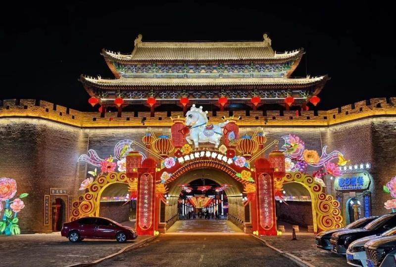 “塞外小北京”定远营古城古韵焕新,贺兰门、吉祥门、如意门、定远门四大城门灯组各具特色,城墙之上,骏马、马头琴、“阿拉善”字样灯组依次排开,地域文化与新春主题相融相生。古城内部,“财神”“凤凰”“双鱼呈祥”等创意灯组巧妙布局,传统韵味与现代美感交织,庄重典雅又不失灵动趣味。