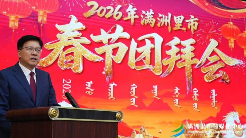 于伟东说,马,象征着忠诚、奋进与坚韧。2026年,我们既要满怀“马到成功”的美好憧憬,更要激荡“一马当先”的壮志豪情。要坚持以习近平新时代中国特色社会主义思想为指导,全面贯彻党的二十大和二十届历次全会精神,深入贯彻落实习近平总书记对内蒙古系列重要讲话重要指示精神,全面落实自治区党委“1571”工作部署,以“马上就办、办就办好”的决心,进一步走好生态优先、绿色发展、开放引领、贸工一体、产旅融合的陆路口岸城市转型振兴之路,奋力谱写中国式现代化满洲里新篇章。
