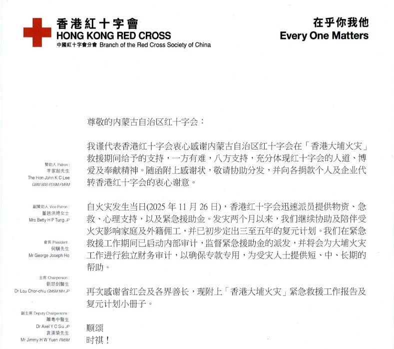 本网讯(草原云·内蒙古新闻网记者 王利军)近日,一封来自香港特别行政区红十字会的感谢信跨越千里送达内蒙古自治区红十字会。信中对自治区红十字会在香港大埔火灾救援期间给予的支持表示衷心感谢。