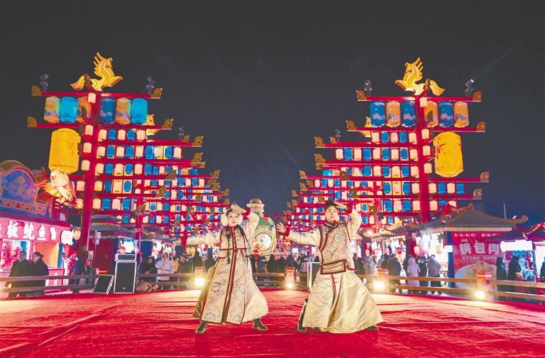 2月18日,演员在乌兰察布之夜街区表演舞蹈。2026乌兰察布之夜以“数智启新程 马年迎好运”为主题,开街以来,街区人气持续攀升,大家欢聚一堂,赏灯、游园、体验非遗、乐享冰雪,处处洋溢着喜庆祥和的节日氛围。草原云·内蒙古新闻网记者 王磊 摄