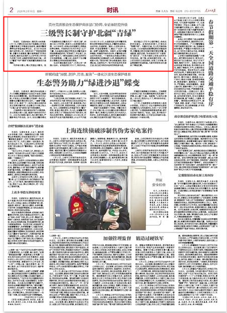2026年2月16日,《人民公安报》第2版刊发题为《克什克腾推动生态保护向多部门协同、全链条防控升级——三级警长制守护北疆“青绿”》的文章,报道了内蒙古自治区克什克腾旗推动生态保护从公安专项工作升级为多部门协同、全链条防控的系统工程,一条以“警蓝”守护“青绿”的高质量发展路径日益清晰。