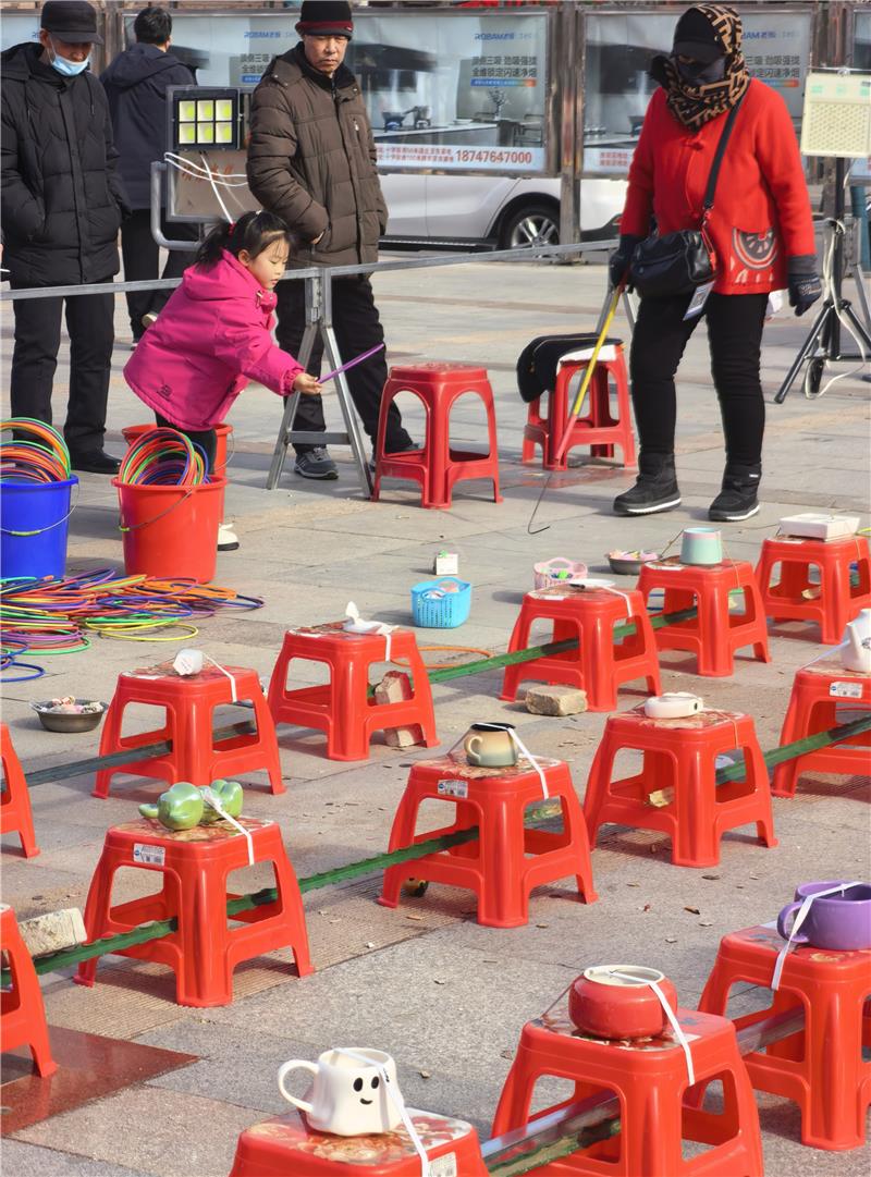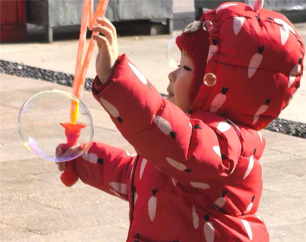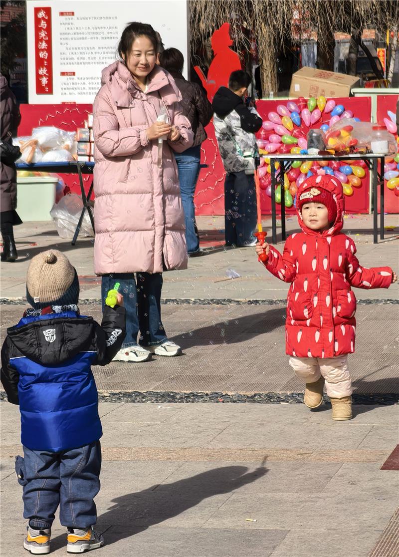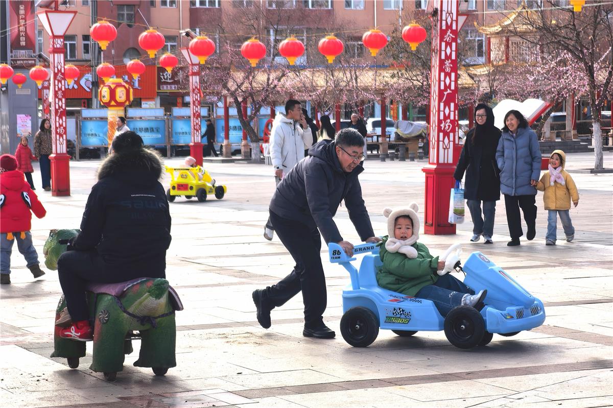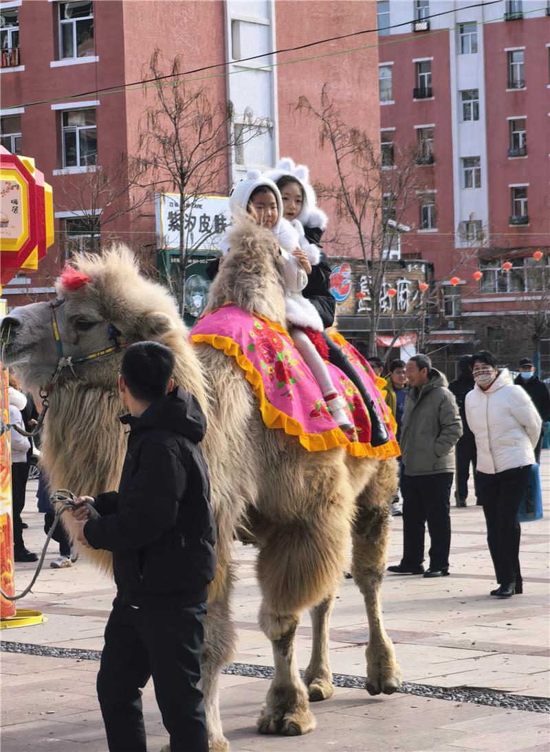 2月20日,在赤峰市林西县春蕾广场,家长和孩子们骑骆驼、坐游乐车、套圈……在春风暖阳中享受春节假期休闲亲子时光。