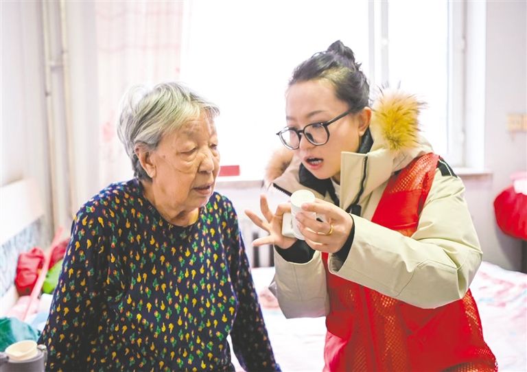 社区工作人员上门为孤寡老人讲解用药说明。草原云·内蒙古新闻网记者 郑学良 摄