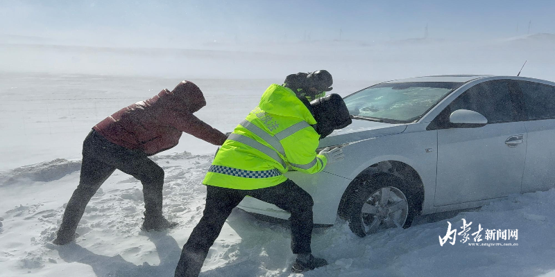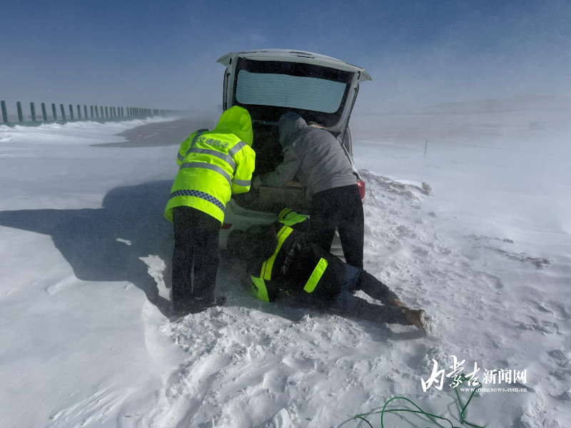 当日11时许,一通带着哭腔的求助电话打破了内蒙古交通运输综合行政执法总队十三支队十七大队五中队值班室的寂静。“我们的车陷在雪里了,风太大根本出不去,车上还有孩子……”接到求助,五中队全体人员没有丝毫犹豫,带上防滑链、牵引绳、热水和食物,大家迅速穿好防寒服,将救援物资塞进车里。车窗外,狂风卷着雪沫,把天地搅成一片混沌,每前进一步都异常艰难。白毛风中,方向难以分辨,队员们凭着对辖区路段的熟悉,在积雪里艰难前行。