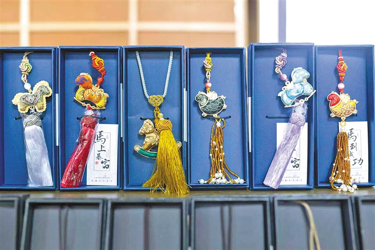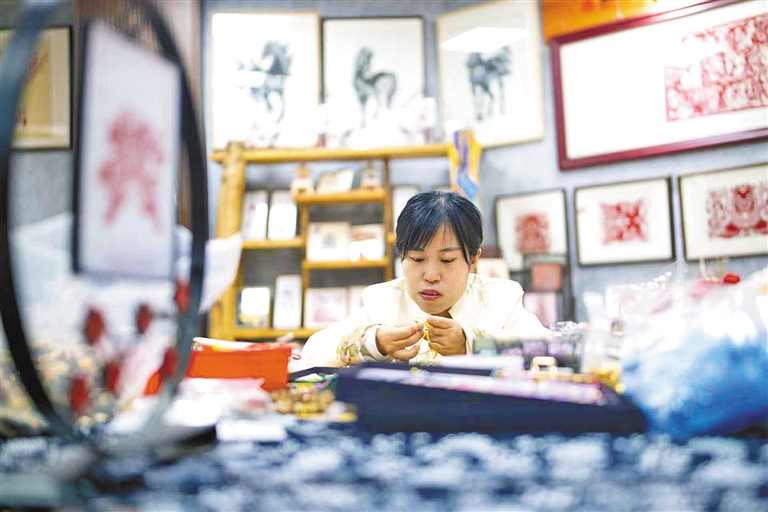 在这里,残疾人学员张小霞正细心制作宋锦挂件。2024年9月来到中心后,她先后学习了宋锦、剪纸、掐丝珐琅等多项非遗技艺。“这里不仅提供了就业岗位,更让我感受到了温暖和信心。”张小霞说。