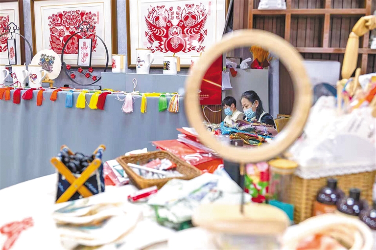 琳琅满目的手工艺品映衬着工作人员忙碌的身影。
