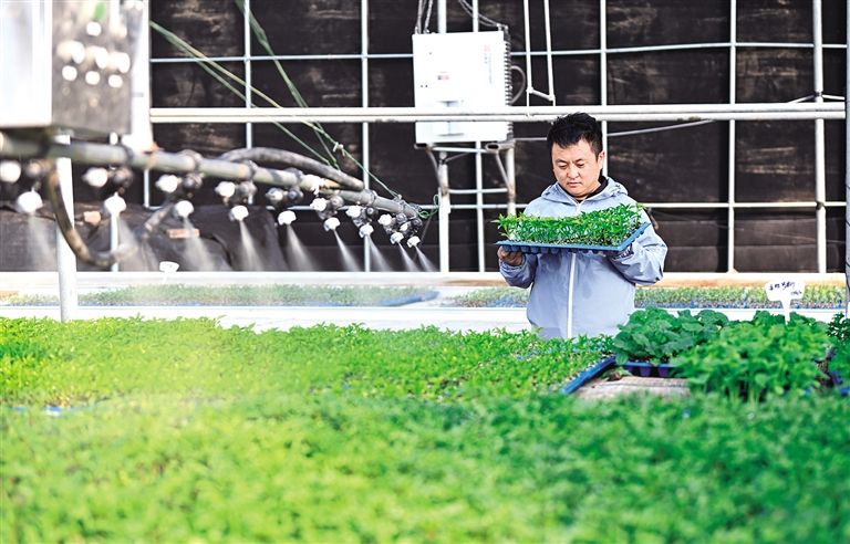 2月24日,在内蒙古蒙苗农业科技有限公司育苗大棚内,工作人员查看蔬菜种苗长势。该公司育苗基地通过工厂化育苗,选育适合当地气候和土壤生长的最优质品种,培育西红柿、辣椒、芹菜等多个品种优质种苗,销往周边盟市以及北京、河北、河南、宁夏等省区市。截至目前,内蒙古通过强化育苗能力建设,已累计建成15个5000万株以上集约化育苗中心。草原云·内蒙古新闻网记者 孟和朝鲁 摄