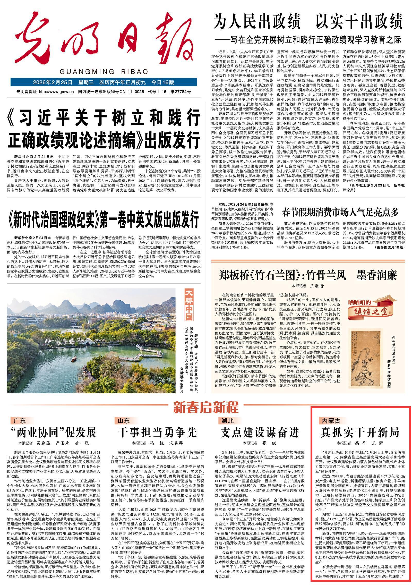 2026年2月25日《光明日报》第1版刊发了《内蒙古:真抓实干开新局》的文章,报道了2月24日上午,春节假期后上班第一天,内蒙古推进高质量发展大会在呼和浩特召开。会议聚焦建设体现内蒙古特色优势的现代产业体系等7项重点工作,着力推动全区高质量发展,实现“十五五”良好开局。