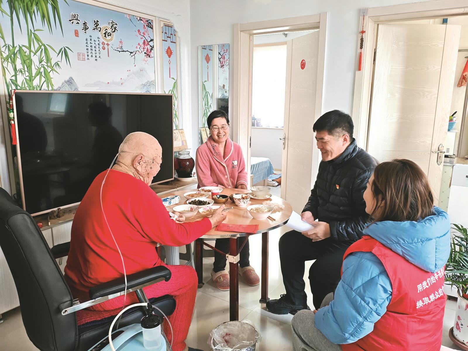 网格员在老党员家中询问老人的身体状况、医保事宜