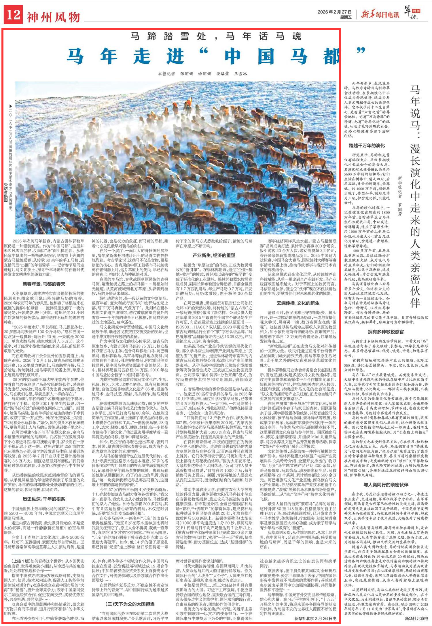 2026年2月27日,《新华每日电讯》第12版刊发题为《马蹄踏雪处,马年话马魂 马年走进“中国马都”》的文章,报道了2026年农历马年新春,内蒙古锡林郭勒草原仍是一片银装素裹。作为“中国马都”,这里并未因风雪而沉寂,反而因“马”而生机勃勃。