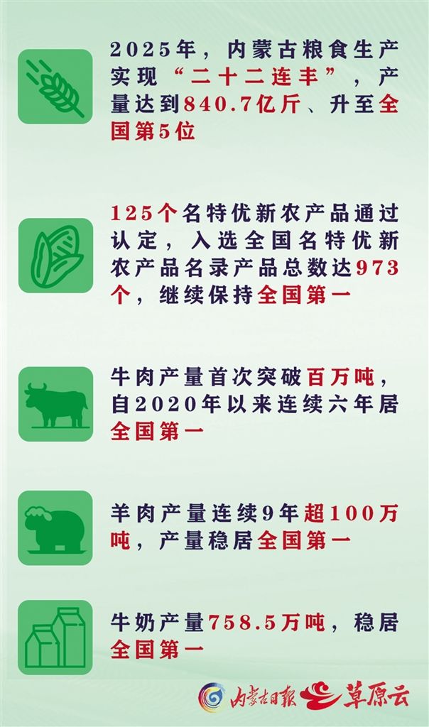 向优而行,向强迈进。站在新起点,内蒙古正以更严的标准、更实的举措、更足的干劲,推动农畜产品向更高价值、更广市场跨越,让“丰盈内蒙古”成为乡村振兴的坚实支撑,成为滋养万家的幸福味道。(草原云·内蒙古新闻网记者 韩雪茹)