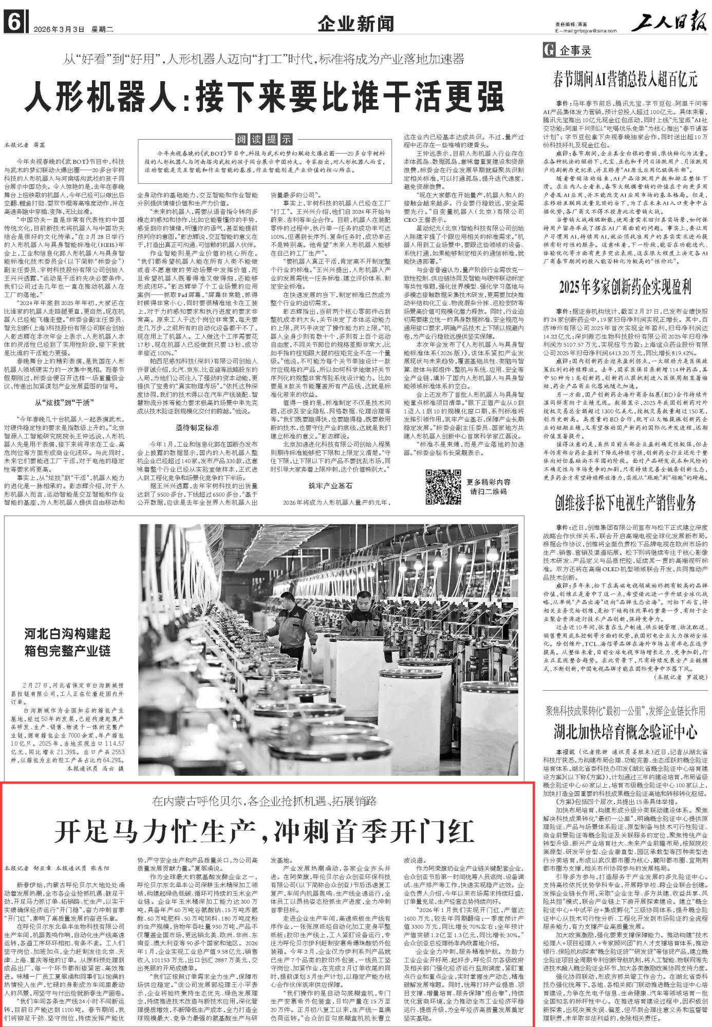 2026年3月3日《工人日报》第6版刊发《在内蒙古呼伦贝尔,各企业抢抓机遇、拓展销路 开足马力忙生产,冲刺首季开门红》的文章,报道了新春伊始,内蒙古呼伦贝尔大地处处涌动着发展热潮,全市各企业抢抓机遇、鼓足干劲,开足马力抓订单、拓销路、忙生产,以实干实绩确保经济运行“开门稳”,奋力冲刺首季“开门红”,奏响了高质量发展的奋进乐章。
