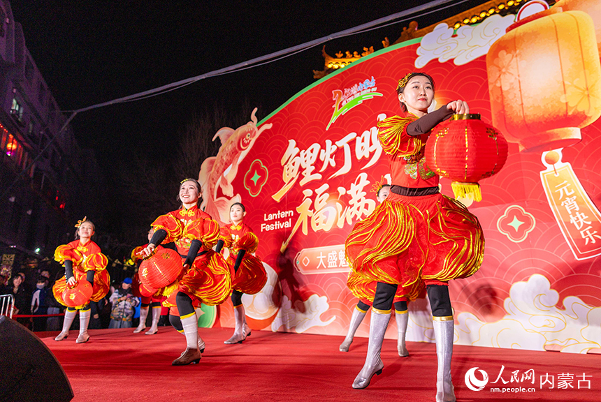 呼和浩特市玉泉区“鲤灯映月 福满上元”鱼灯夜游会现场,演员在表演舞蹈。丁根厚摄