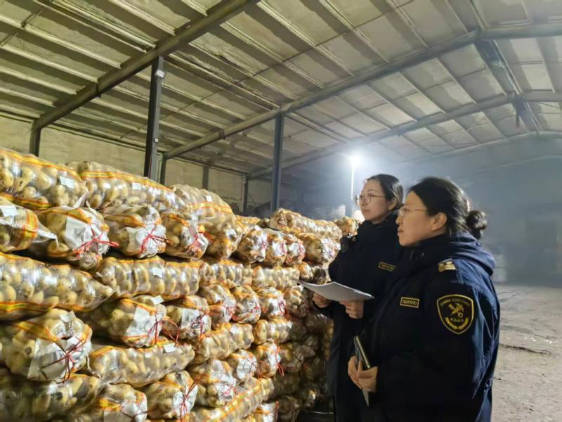 海拉尔海关关员对出口马铃薯进行监管(摄影:张欣)