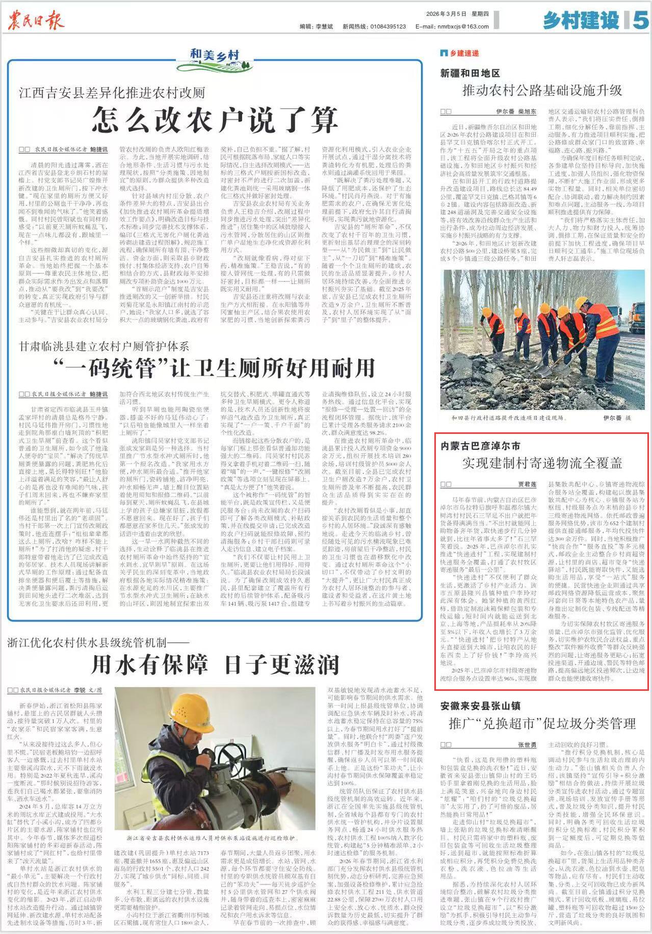 2026年3月5日《农民日报》第5版刊发题为《内蒙古巴彦淖尔市:实现建制村寄递物流全覆盖》的文章,报道了内蒙古巴彦淖尔市扎实推进“快递进村”工程,实现建制村快递服务全覆盖,打通了农村牧区寄递服务“最后一公里”。