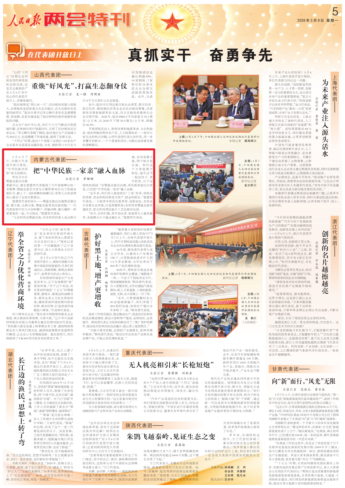 2026年3月9日,《人民日报》第5版刊发题为《内蒙古代表团——把“中华民族一家亲”融入血脉》一文,报道了3月6日下午,内蒙古代表团开放日现场,“中华民族共同体”成为高频词。