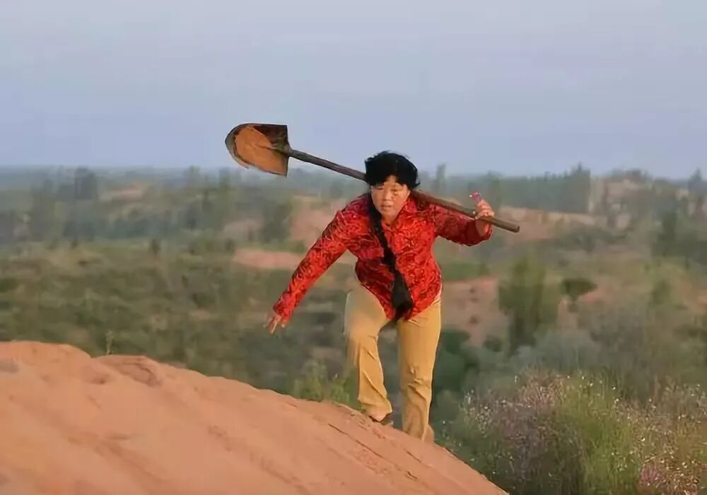在沙漠上植树,先是拿长六尺的钢钎子往沙地上捅树窟窿,然后插进树栽子,浇上水,再用脚踩实。一天拿钢钎插多少树窟窿、栽多少树,殷玉珍也不清楚,累得瘫在地上就算收工了。殷玉珍与沙漠苦斗了40年。