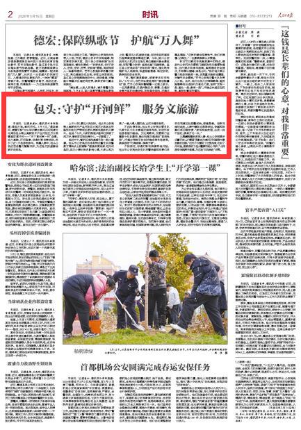 2026年3月15日《人民公安报》第2版刊发了《包头:守护“开河鲜” 服务文旅游》的文章,报道了3 月 7 日,“春启黄河、凌舞文脉”2026 年内蒙古黄河开河观凌文化周在包头启幕,近 7 万名游客参与各类活动。包头近百名警力全程值守,在巡逻防控、纠纷调解、交通疏导、隐患排查等方面保驾护航,用坚守守护文旅盛宴,赢得游客点赞。
