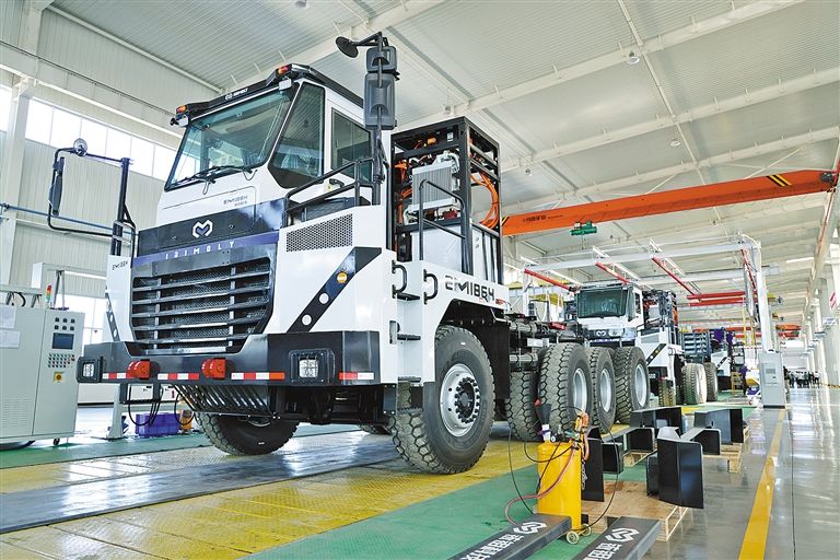 位于乌海市海勃湾高新技术产业开发区的乌海铱钼新能源科技有限公司内,“铱钼牌”新能源智能矿卡正在进行批量生产。高瑞鹏 摄