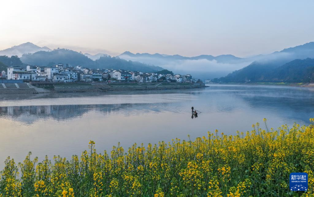 在安徽省黄山市歙县深渡镇漳潭村新安江畔拍摄的晨景。新华社发(施亚磊摄)