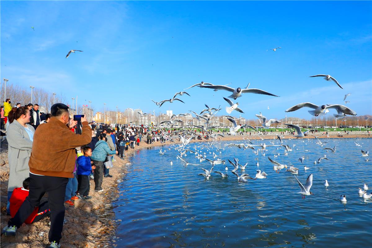 3月8日,在乌海湖一号码头,红嘴鸥的到来吸引大批市民前来观鸟。郝鑫 摄