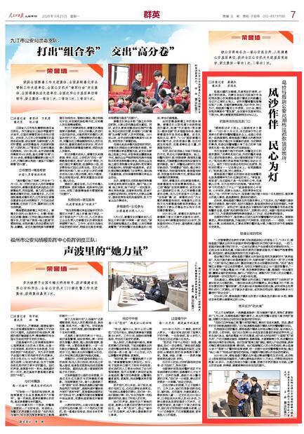 2026年3月23日《人民公安报》第7版刊发了《乌拉特后旗公安局潮格温都尔镇派出所:风沙作伴 民心为灯》的文章,报道了内蒙古自治区巴彦淖尔市乌拉特后旗公安局潮格温都尔镇派出所获多项荣誉,以英模为引领,推行便民服务,创新防控与矛盾化解模式,强化反诈预防,2025 年辖区刑事案件零发案,群众满意度超 98%。